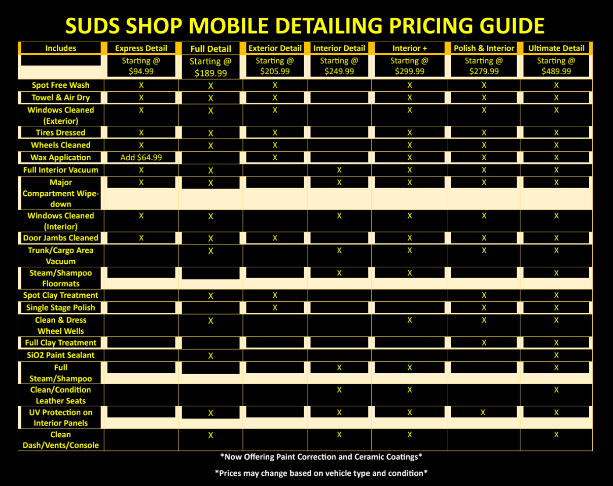 At Suds Shop Mobile Detailing, we offer competitive pricing for high-quality car care services delivered directly to your doorstep. Our mobile detailing services provide unmatched convenience and exceptional results. Here’s a detailed look at our pricing: